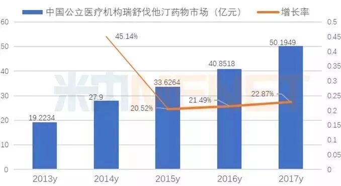 据米内网数据显示,2017年中国公立医疗机构瑞舒伐他汀钙制剂终端销售额达到了50.2亿元,同比上一年增长了22.87%。竞争格局中,阿斯利康的原研药可定占据了56.71%,鲁南贝特的瑞舒伐他汀钙片、胶囊和分散片瑞旨占13.70%,京新药业的京诺占13.37%,正大天晴的托妥占12.61%,海正药业的海舒严占1.98%,南京先声东元的舒夫坦占1.63%。