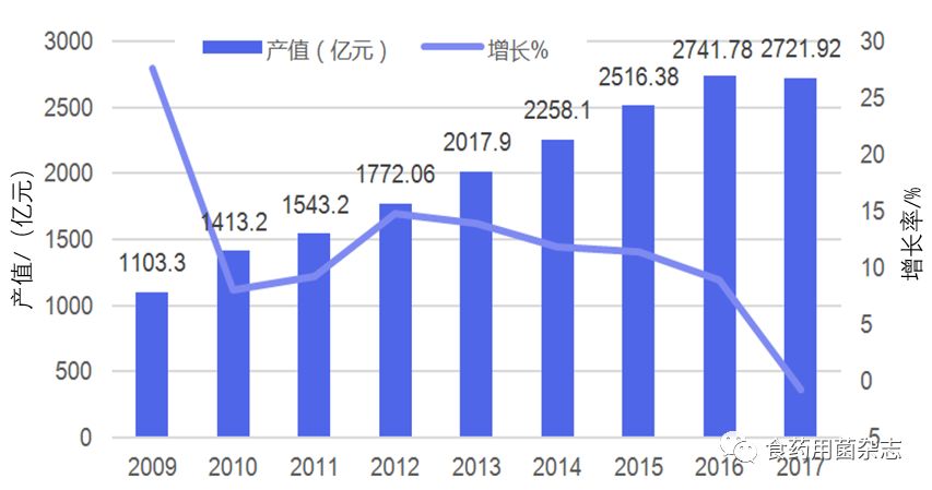 图7 2009—2017年我国食用菌年产值变化