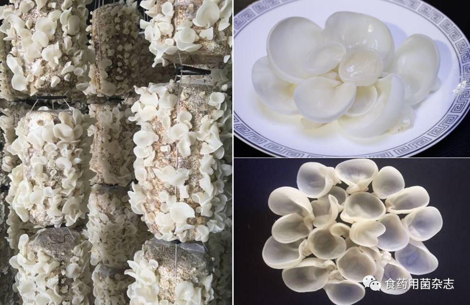 (4)关于药用真菌的栽培研究。一是在标准化栽培领域进行了大量的研究,开展了工业化栽培模式和示范推广工作,在食用菌和药用真菌的产业化中发挥了重要作用。各种新品种已经培育和推广,创造了经济效益。如我们选育的玉木耳品种(图5),其功效已被证明优于黑木耳和毛木耳。二是药用真菌经液体发酵和固体发酵培养,为药用真菌的可持续开发利用提供保障。三是稀有和独特的药用真菌资源在物种资源调查中发现、引进、驯化和培育药用真菌新品种,增加资源。如我们从西非引进一种药用菌,命名为百叶菇,其在印度是一种广泛用于治疗肝病的很好的药剂。