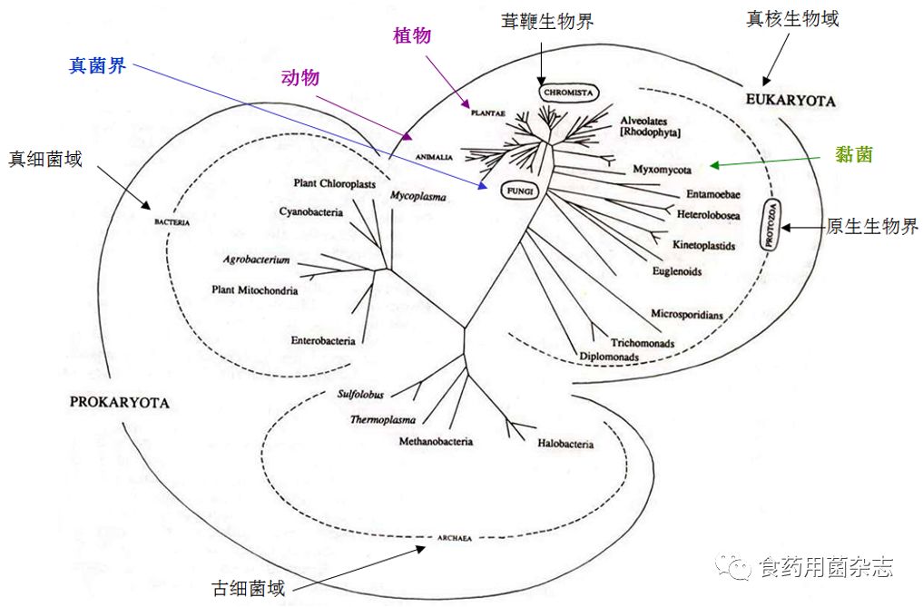 药用菌的定义一直有争议,广义上讲,药用菌是一切用于制药的菌物;狭义上讲,药用菌是药用的大型真菌。在卡尔·乌斯的三域系统(图1)中,真菌界与植物界、动物界等同隶属真核生物域,而黏菌由于具备肉眼可见,手可采摘的特征,我们认为其也应属于大型菌物的重要组成部分。在种类多样性上,科学家估计,全球植物数量约30万种,动物约1060万种,而真菌数量约植物的5倍,1991年Hawksworth认为150万种左右。但从目前已描述的种类看,反差较大,植物、动物我们已知各为27万种和132万种,而菌类则知之较少,被描述的仅有12万种(指通俗的描述种,含异名等)。