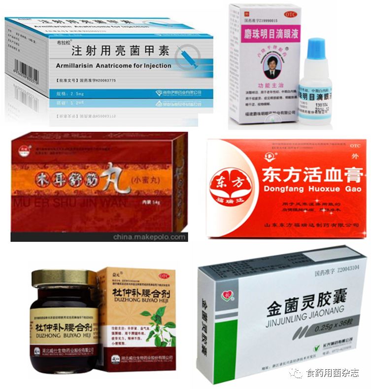 (1)市面常见的药用真菌的中成药(图8)多种多样,涉及各种剂型。颗粒如木耳舒筋丸(黑木耳),粉末如五苓散(茯苓),片剂如亮菌甲素片(亮菌),注射剂如注射用亮菌甲素(亮菌),胶囊如金菌灵胶囊(金耳)和益肾康胶囊(白囊耙齿菌),糖浆如亮菌糖浆(假蜜环菌),饮剂如杜仲补腰合剂(香菇),眼药水如麝珠明目滴眼液(冬虫夏草),膏药如东方活血膏(黑木耳、金针菇)等。市面上常见药用真菌的存在问题列于表1,供大家参考。
