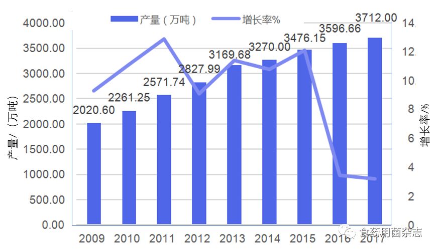 图6 2009—2017年我国食用菌年产量变化