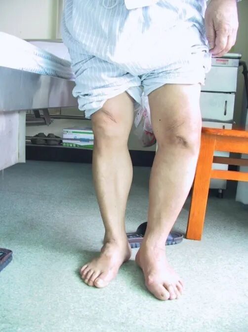 71岁的陈伯,双膝疼痛10余年。X线片提示双膝是晚期骨关节炎,非常明显的顺风腿。双侧做了人工膝关节表面置换术后,术后第二天就可以下地走路,目前可以正常出行,生活健康