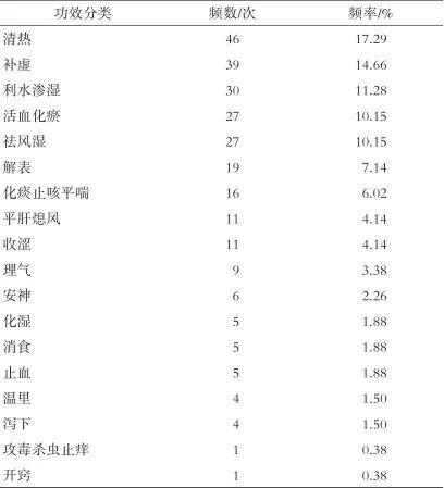 本研究涉及的266味中药的药味以甘、苦、辛为主,累计频率为81.71%;寒、平、温药性排前3位,累计频率为71.06%;主要归于肝、肺、胃、脾、肾经,累计频率为76.13%;功效以清热、补虚、利水渗湿、活血化瘀和祛风湿为主。见表2、表3、表4、表5。