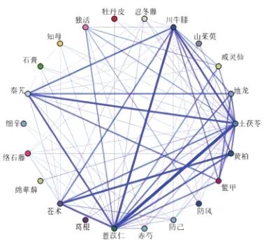 运用SPSS Modeler 18.0软件对266味中药进行关联规则分析,设置弱链接上限为60,强链接下限为100,结果得到强链接(频数≥100)药物组合120个,其中包含中药22味,见图1。按频数由大到小排列,排名前20位的药物组合主要为土茯苓-薏苡仁、川牛膝-薏苡仁、苍术-黄柏、川牛膝-土茯苓和秦艽-土茯苓等,见表6。