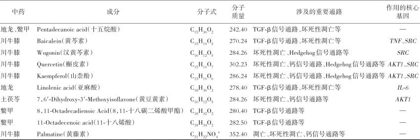 根据聚类分析结果,选取核心药方(即地龙、鳖甲、秦艽、川牛膝、薏苡仁、土茯苓)进行网络药理学研究。