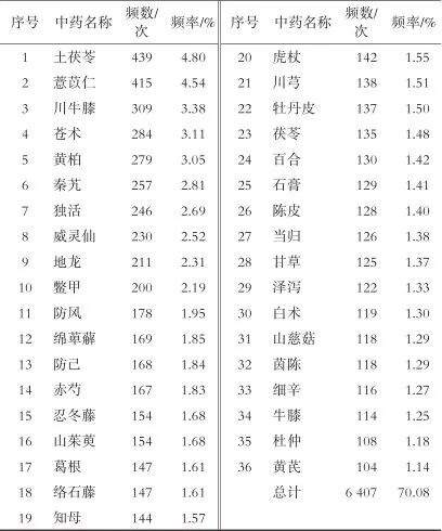 本研究收集的659首处方共涉及中药266味,总使用频次为9 143次。其中使用频率≥1%的中药有土茯苓、薏苡仁、川牛膝、苍术、黄柏、秦艽、独活和威灵仙等,共36味,占总频次的70.08%,为高频用药。见表1。