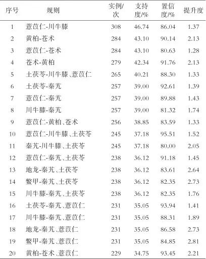 采用Apriori建模进一步分析266味药物之间的配伍关系,设置支持度为20%,置信度为80%,最大前项数为2。结果得到144个药物关联规则组合,共包含22味中药,这些中药与前面分析得到的22味中药相同。按照支持度百分比排名,排名前20的关联规则组合主要是薏苡仁-川牛膝、黄柏-苍术、薏苡仁-苍术、苍术-黄柏等(见表7),且提升度均>1,该关联规则被认为具有正向关联。