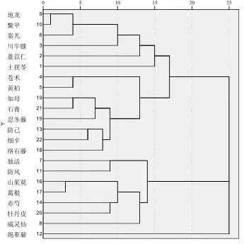 将上文涉及的中药进行交集分析,最终得到高频率使用的中药22味,即鳖甲、苍术、赤芍、川牛膝、地龙、独活、防风、防己、葛根、黄柏、络石藤、绵萆薢、牡丹皮、秦艽、忍冬藤、山茱萸、石膏、土茯苓、威灵仙、细辛、薏苡仁和知母。采用SPSS Statistics 20.0软件对22味中药进行系统聚类分析,生成树状聚类图。见图2。