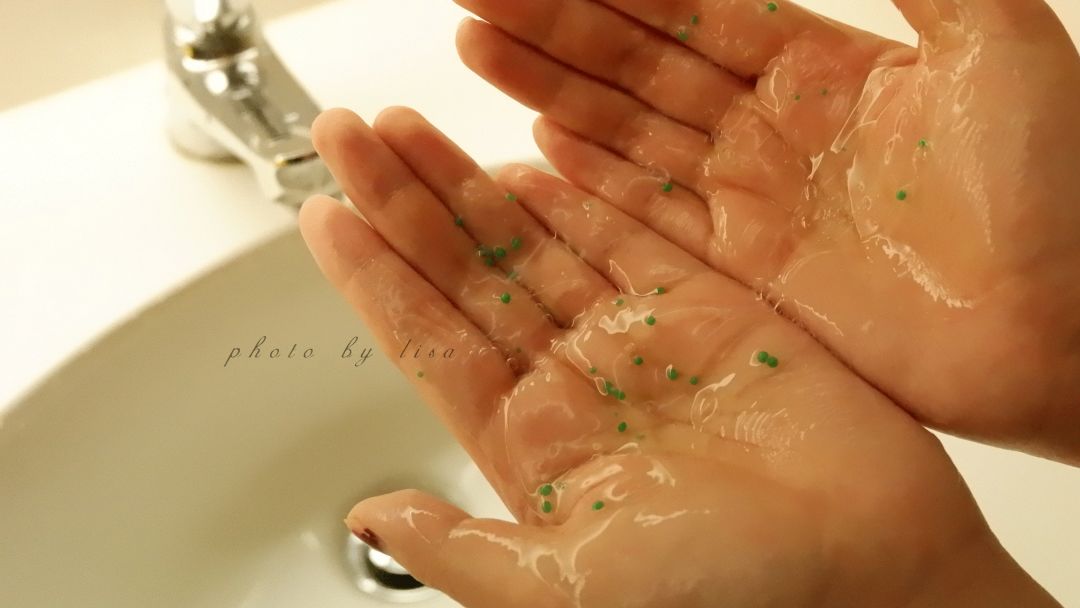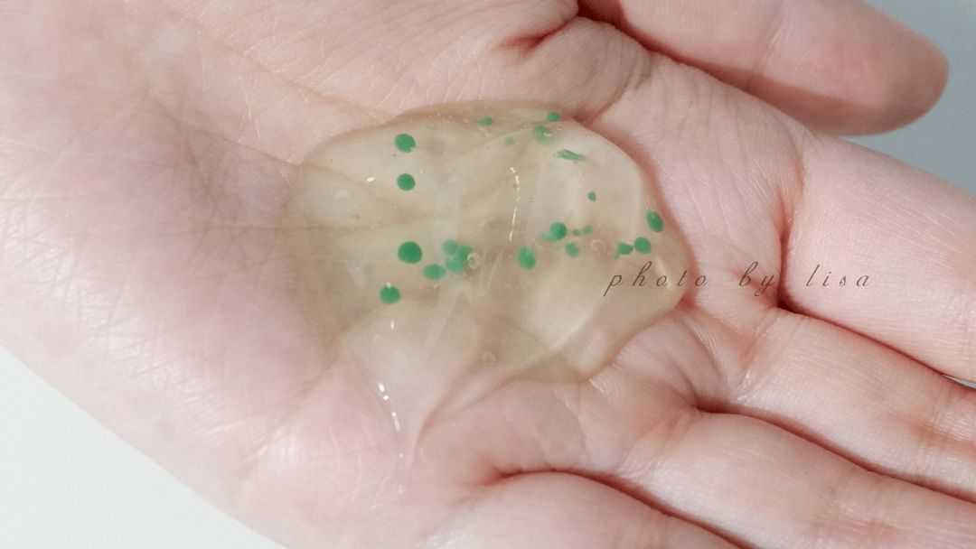 洗发水挤出来之后,能看见里面有这样绿色的凝珠,这些凝珠都是精油颗粒,主要成分是香橙,巴西人参精萃及薰衣草。