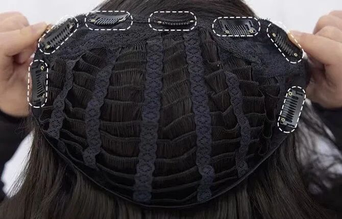 而假发片呢,通常分为直片式假发和半头套式假发,直片又分为U型,一片式和三片式。但无一例外,假发片都不会包裹住头顶,只会增加后脑勺以及两侧的发量,对地中海和头发分缝大的女生不友好。