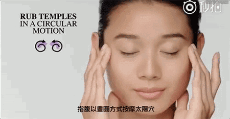 手指并拢,指尖轻轻按在太阳穴上,逆时针方向打圈8次。