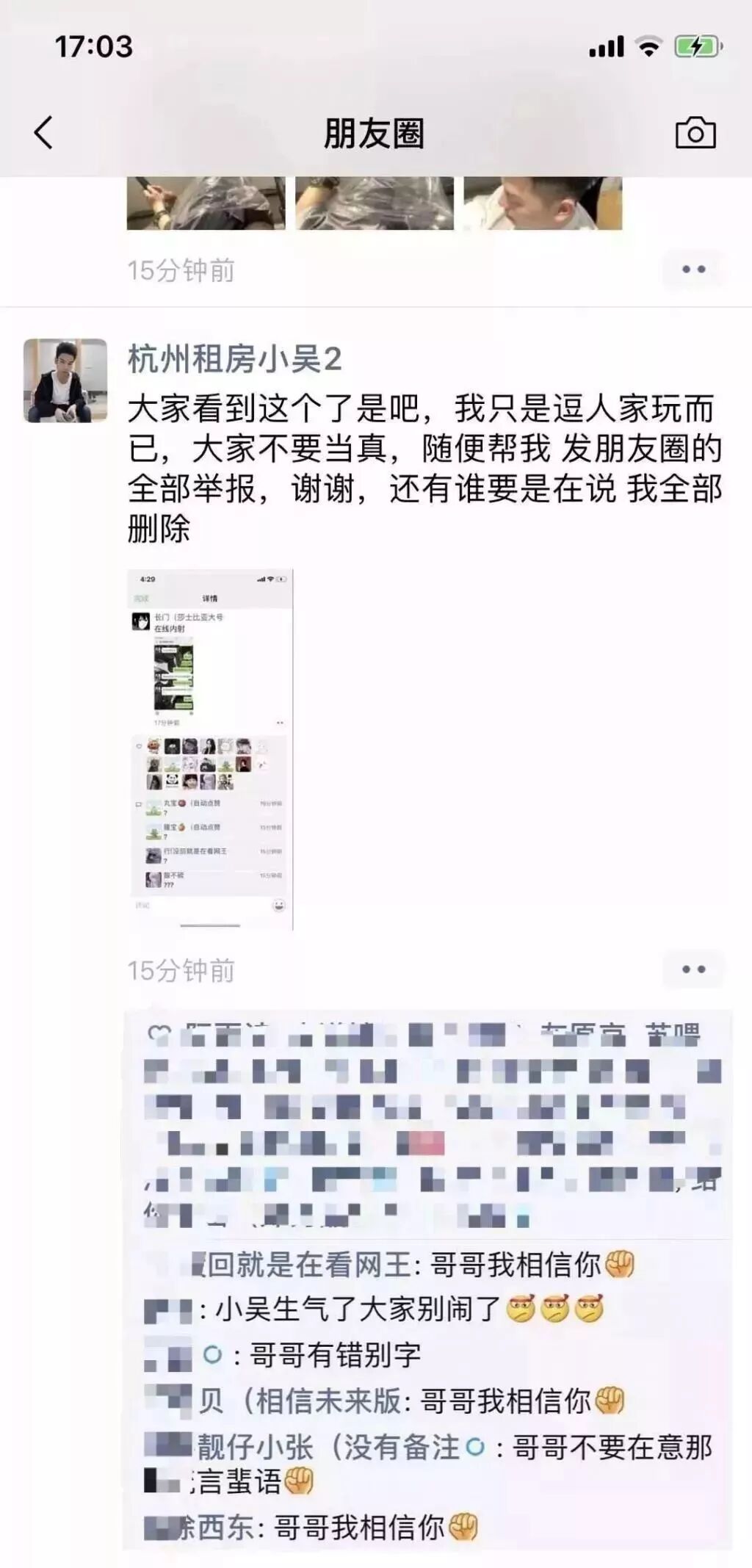 照片一经曝光,便引发了巨大的讨论,小吴在朋友圈紧急公关,声称自己只是逗人家玩而已,他的粉丝齐刷刷地打出哥哥我相信你。
