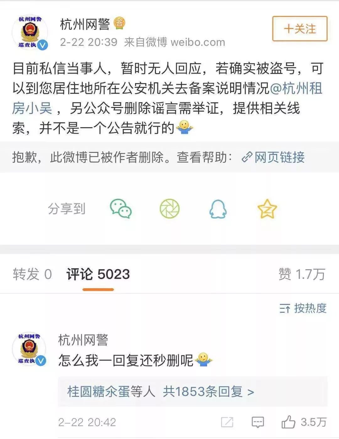 结果网警接到小吴的这则案子之后,多次私信当事人没有得到回应,让警方万万没想到的是刚关注到小吴的事情,没多久小吴就删掉了关于在自己这件事情的朋友圈。同时也让网警尴尬的回复了一句怎么我一回复还秒删呢?