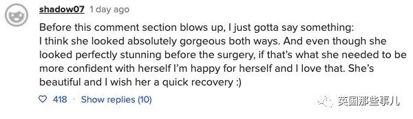 我感觉她手术前和手术后都很美。虽然我认为她原来就够完美了,但如果她需要靠这个手术增加自信,那我也为她开心,她很美,希望她早日恢复。