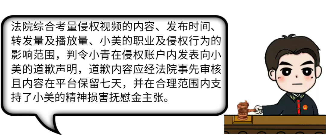 小美向平台投诉后,平台及时进行了断链处理,后经向平台核实,发布该侵权视频的账户是小青(化名)实名注册的,于是小美委托律师向小青发送了《律师函》,要求小青立即删除侵权视频并向其赔礼道歉。