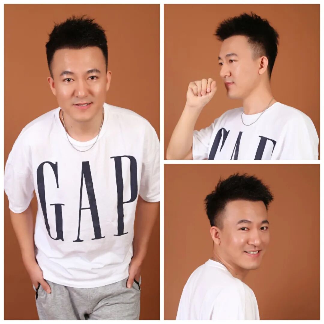 2019年4月植发前的杨柏松,两侧额角毛发缺失、发际线后移严重,显老、显颓废。