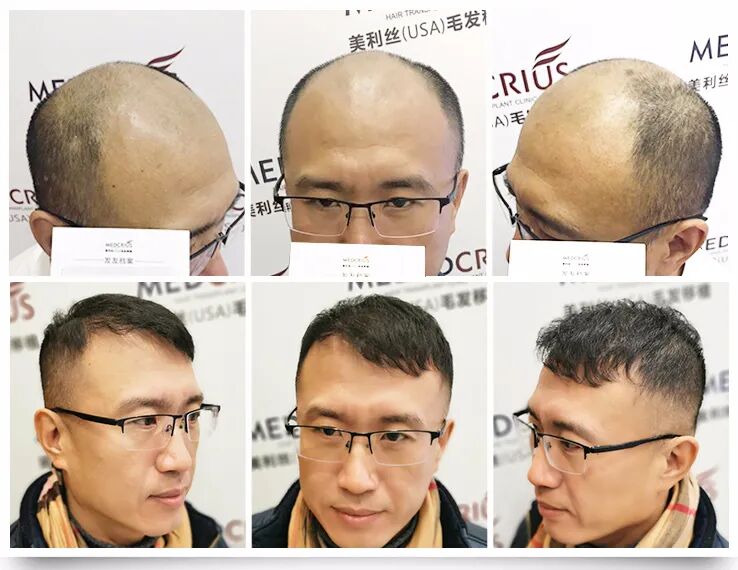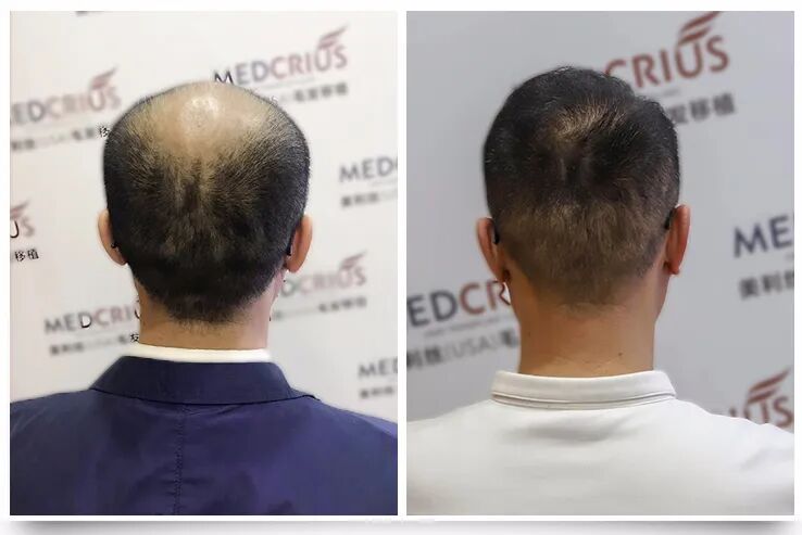 37岁公务人员,遗传性脱发近10年植发前前额及头顶严重缺失,呈U型脱发,植发8个月后,毛发移植呈现初步效果,种植区域原生发完美结合,看不出任何种植痕迹。