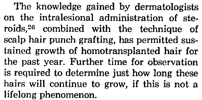 1970年的Norman Orentreich自己也不知道种植的头发是不是会终生存在,他只知道自己过去做的这些手术是成功的,他在论文里这样写道: