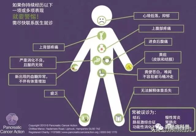 胰腺癌是一种特别善于伪装的病,由于胰腺位于腹部左上方,前面有胃,周围有肠子等器官掩盖,如果出现病证,就很容易漏诊或误诊。