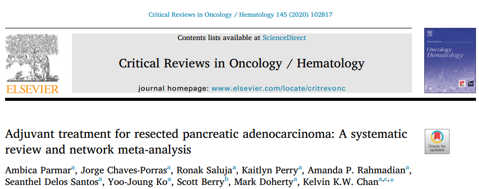 2.Parmar A,Chaves-Porras J,Saluja R,Perry K,Rahmadian AP,Santos SD,Ko YJ,Berry S,Doherty M,Chan KKW.Adjuvant treatment for resected pancreatic adenocarcinoma: A systematic review and network meta-analysis.Crit Rev Oncol Hematol.2020 145():102817.