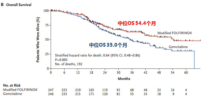 中位OS mFOLFORINOX vs 单药吉西他滨为 54.4个月 vs 35.0个月,HR 0.64,死亡风险下降了36%,差异具有统计学意义,P=0.003