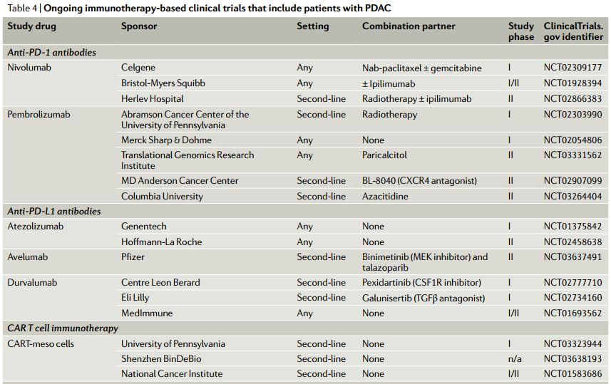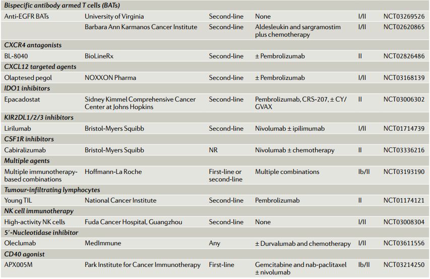 一项I期研究评估了纳武利尤单抗+cabiralizumab用于胰腺癌的疗效,33例经治胰腺癌患者队列中的总缓解率为 13%。随后开展了一项II期试验,以评估cabiralizumab+纳武利尤单抗±化疗的疗效,目前正在进行中(NCT03336216)。其他多项评估免疫联合治疗的临床研究正在进行中(表3)。