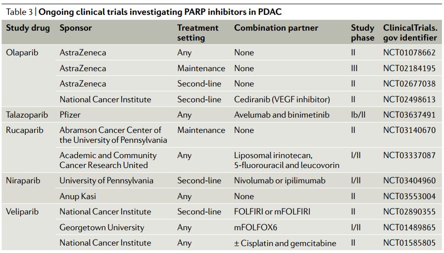 目前,胰腺癌中PARP抑制剂的研究主要集中在生殖系或体细胞BRCA1/2或PALB2突变患者,这部分患者占14%。全外显子组测序和RNA测序显示,BRCA1/2、PALB2、ATM、CHEK2和RAD51见于高达24%的患者中。目前,美国和以色列正在进行两项II期研究,以评估奥拉帕利在DDR缺失胰腺癌中的疗效,美国研究的初步结果显示缓解率为20% (n = 11)。