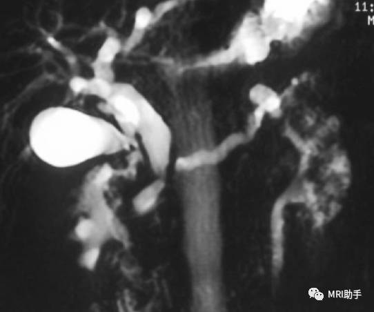 胰头癌MRCP:胆总管扩张,梗阻端呈锥形,主胰管明显扩张并在肿块处中断