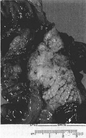 胰头癌:肿瘤呈白色,部分已侵及十二指肠壁
