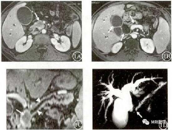 图1A:胰头钩突肿块(白箭),边缘轻度强化,境界清楚。1B:肿块近端胆胰管、胆囊扩张(白箭)。1C:胰管均匀增粗(白箭头),在胰头钩突处(白箭)突然截断,与MRCP(1D)显示的胰管扩张和截断(白箭)征象一致