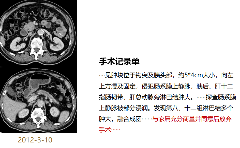 图19 患者胰腺影像检查图(2012-3-10)及手术记录单