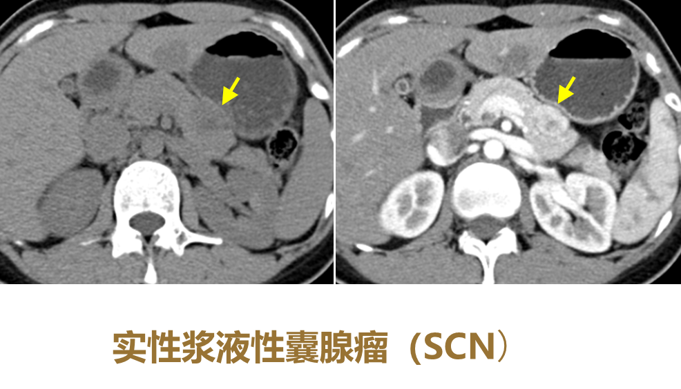 现在胰腺粘液囊腺瘤称为粘液性囊腺肿瘤(MCN)。浆液性囊腺肿瘤(SCN)有5个类型,如果是微囊型,蜂窝征可以完全跟MCN鉴别;如果是寡囊型,则容易和MCN发生鉴别困难,区别的方法是花瓣征或束腰征,区别于MCN的囊内囊征或高张力。此外,SCN是富血供肿瘤,快进快出诊断多有助于鉴别。