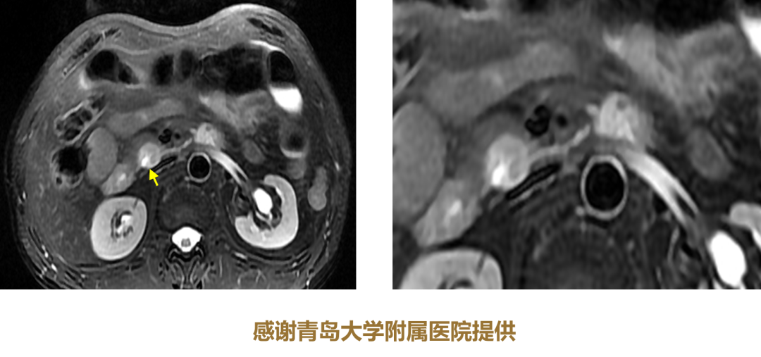 病灶跟胰腺分界不清时,中心位置在哪里非常重要。此外,病灶跟胰腺之间的关系,比如鸟嘴征、周边有推移表现也非常重要。如果是鸟嘴征,肯定考虑胰腺起源;如果是通过胰腺推移的,当然是胰外压迫;对于肿块非常大的肿瘤,胰内跟胰外有时判断比较困难。较容易出现错误的是胰周淋巴结的集合,有时被诊断成胰腺癌。此处应注意,淋巴结集合多环状强化,磁共振更有助于鉴别,T1 高信号、T2 低信号直接可以做出鉴别诊断。