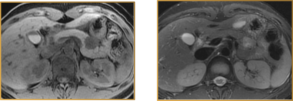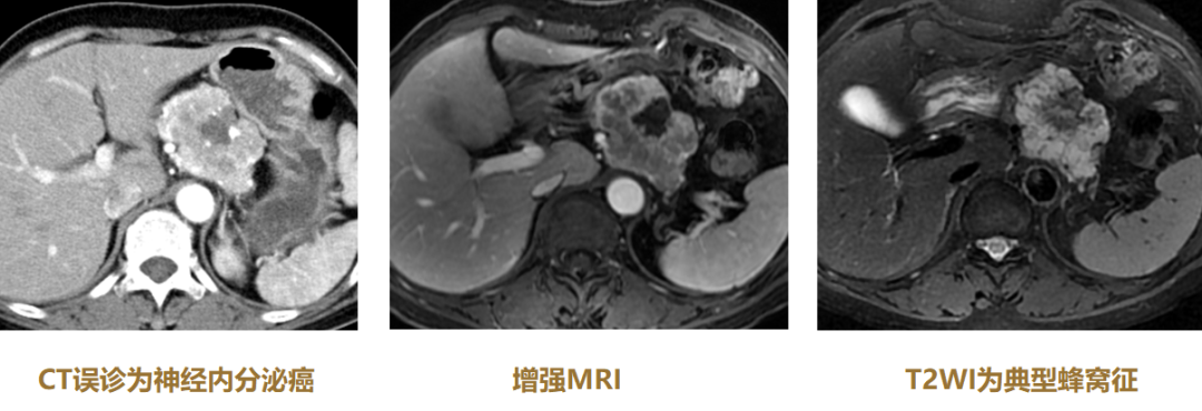 对浆液性囊腺瘤(SCN)非常重要。微囊型SCN(全病灶蜂窝征+中心钙化+快进快出);胰腺癌-病灶内蜂窝征,必须看T2WI!