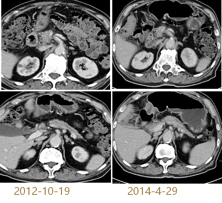 与前片比较,未行任何治疗,胰头体积缩小,胰管扩张减轻,最后临床诊断慢性局灶性胰腺炎。最终影像学战胜病理诊断!