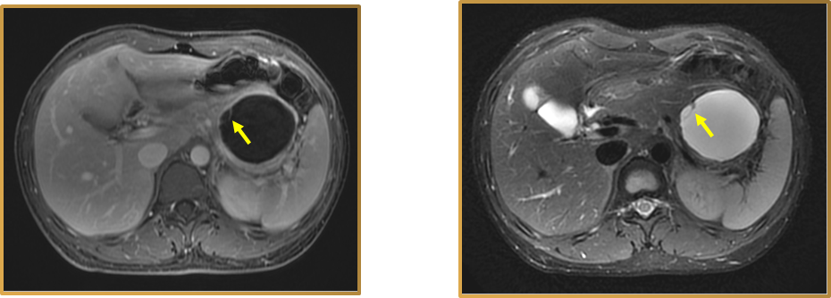 总体而言,MRI对于胰腺囊性病变是首选,考虑到临床诊断价值及无辐射损伤方面,无论是诊断还是随诊都应选择MRI。但CT 也有价值,比如对实性病变进行薄层扫描。在病灶内钙化和急性期出血方面,MRI不如CT。而对于小的(如脂质类的)病变,MRI有同反相位可以观察。