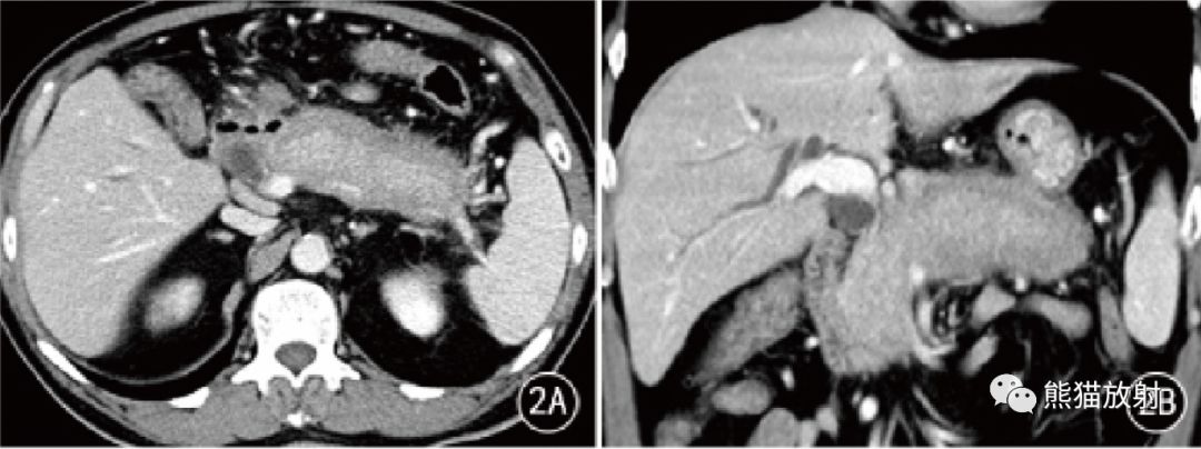 图 2 男,63岁。AIP 胰腺弥漫性病变, CT门静脉期胰腺弥漫性肿胀呈腊肠样,周围见包壳,胰管未见扩张,脾静脉变细狭窄;门静脉期冠状位重组胰腺段胆管狭窄,管壁增厚 。