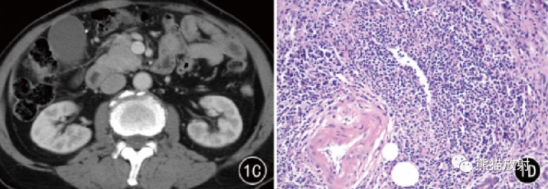 图1 男,75 岁。AIP 胰头部局灶性病变,CT平扫呈稍低密度,增强动脉期和门静脉期渐进性均匀强化。镜下见胰腺导管管壁增厚,周围炎性浸润和纤维化,闭塞性静脉炎( HE × 200)。