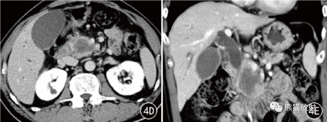 图4 男,65 岁。PDAC 胰头钩突部中分化导管腺癌。CT平扫显示略低密度肿块,增强扫描动脉期肿块轻度不均匀强化,门静脉期和延迟期渐进性强化不明显。冠状MPR示胰腺、尾部萎缩,胰管扩张,胆总管下端受侵、变窄,其上方胆内外胆管明显扩张。