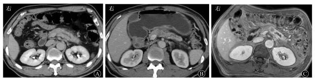 图158岁男性胰体导管腺癌合并急性胰腺炎患者的影像学表现 A 计算机断层扫描增强门静脉期图像示胰腺肿胀,胰体尾部胰管轻度扩张,胰周少许渗出 B 2个月后计算机断层扫描增强门静脉期图像示胰腺体积减小,周围渗出减少,胰体见稍弱强化结节,远端胰管扩张C 2个月后磁共振增强门静脉期图像示胰腺体部弱强化结节,显示更清晰,远端胰腺体尾部强化明显,胰管扩张,术后病理证实为胰体导管腺癌,阻塞胰管引起胰腺炎