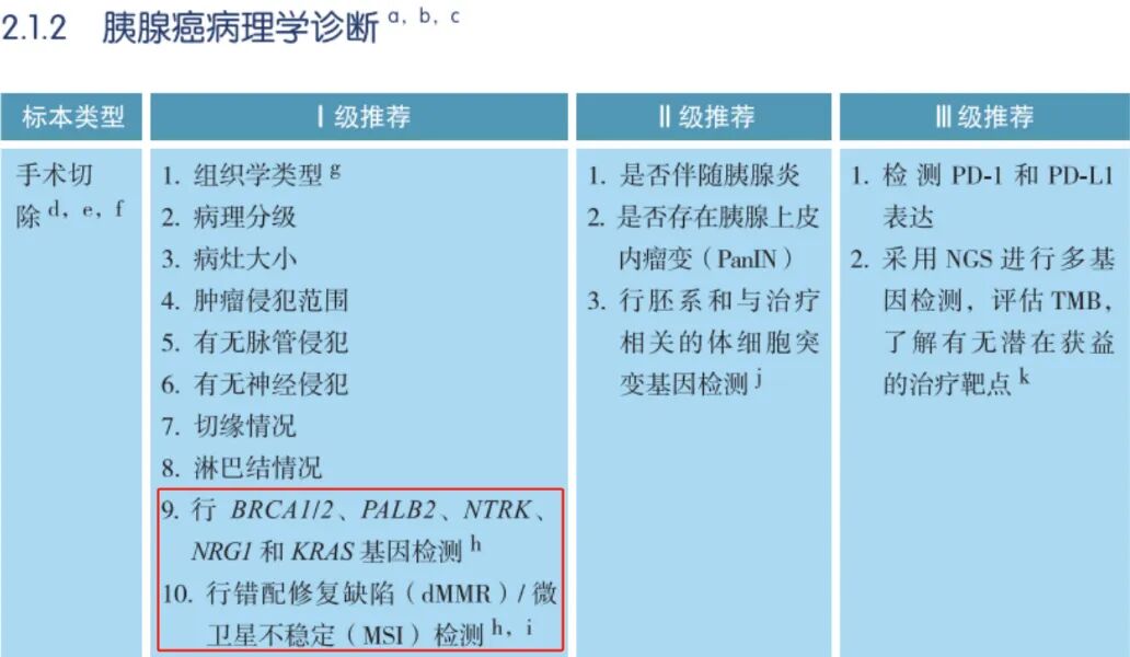 CSCO指南将BRCA1/2、PALB2、NTRK、NRG1、KRAS和MSI/MMR检测纳入胰腺癌病理学诊断Ⅰ级推荐,样本类型为手术切除标本、穿刺活检标本或细胞学标本。