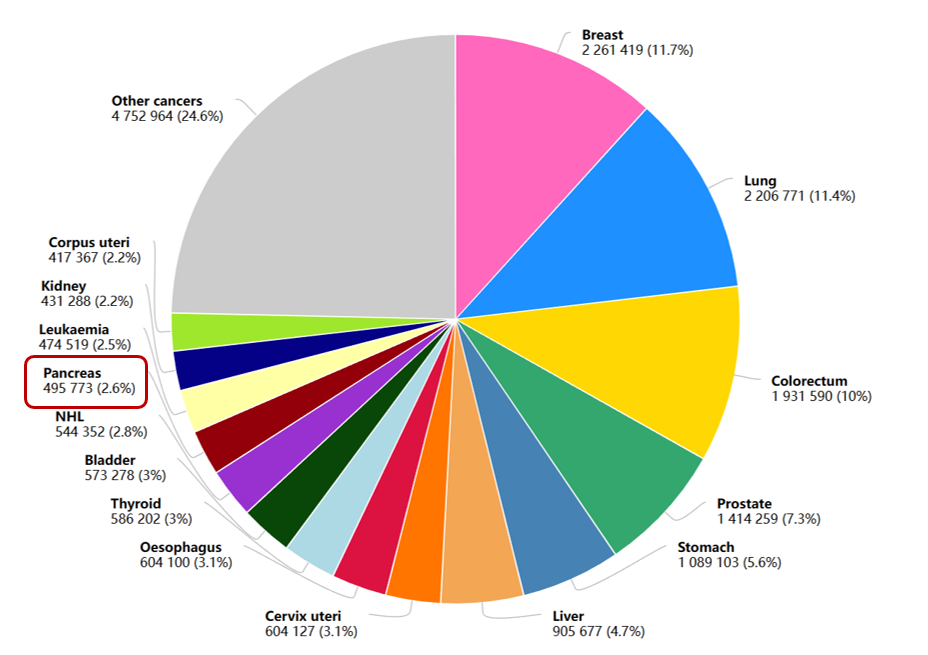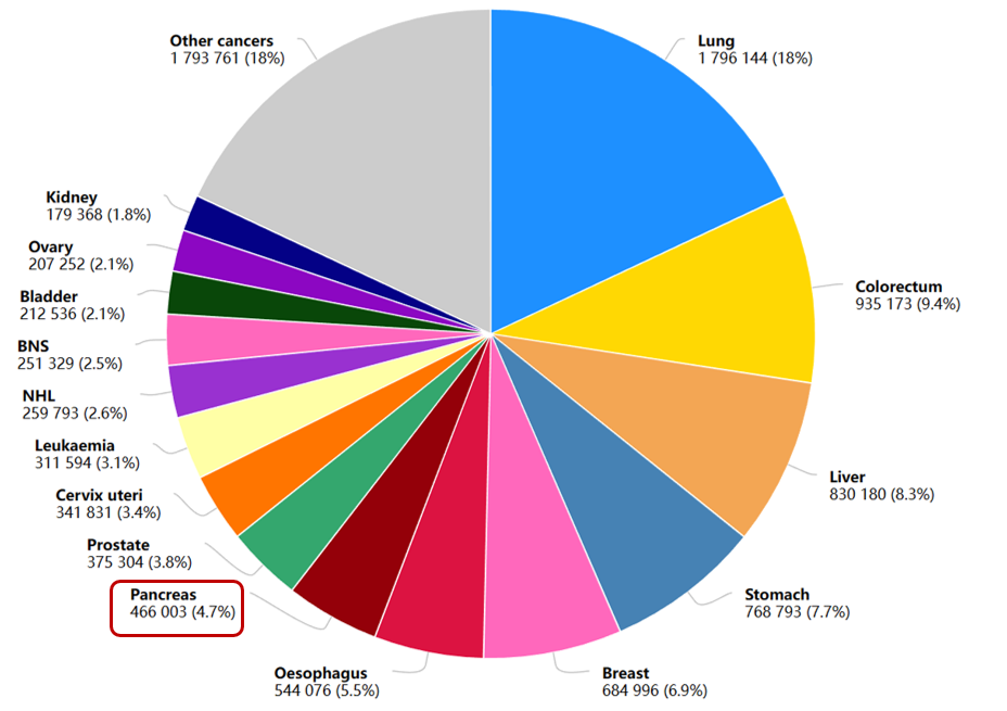 近年来,胰腺癌的发病率在国内外均呈明显的上升趋势。根据世界卫生组织(WHO)的统计,2022年全球新发胰腺癌495773例,占所有癌症新发病例的2.6%,排第14位;全球胰腺癌相关死亡466003例,在所有癌症中排第7位。