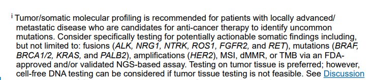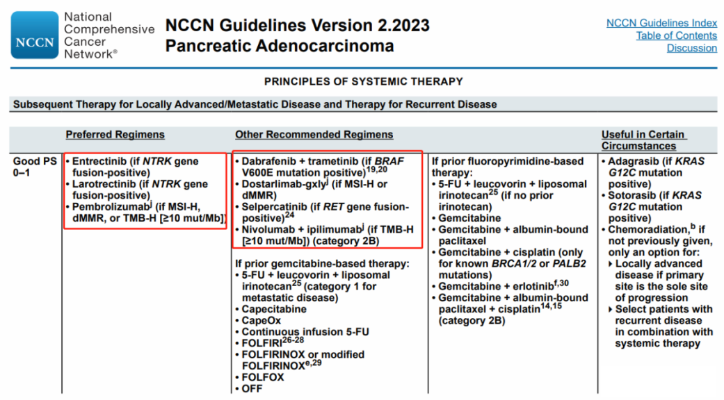 NCCN指南指出对于局部晚期/转移性胰腺癌患者可进行基因检测,包括但不限于ALK、NRG1、NTRK、ROS1、FGFR2、RET融合,BRAF、BRCA1/2、KRAS、PALB2基因突变以及HER2扩增、MSI/MMR、TMB等。