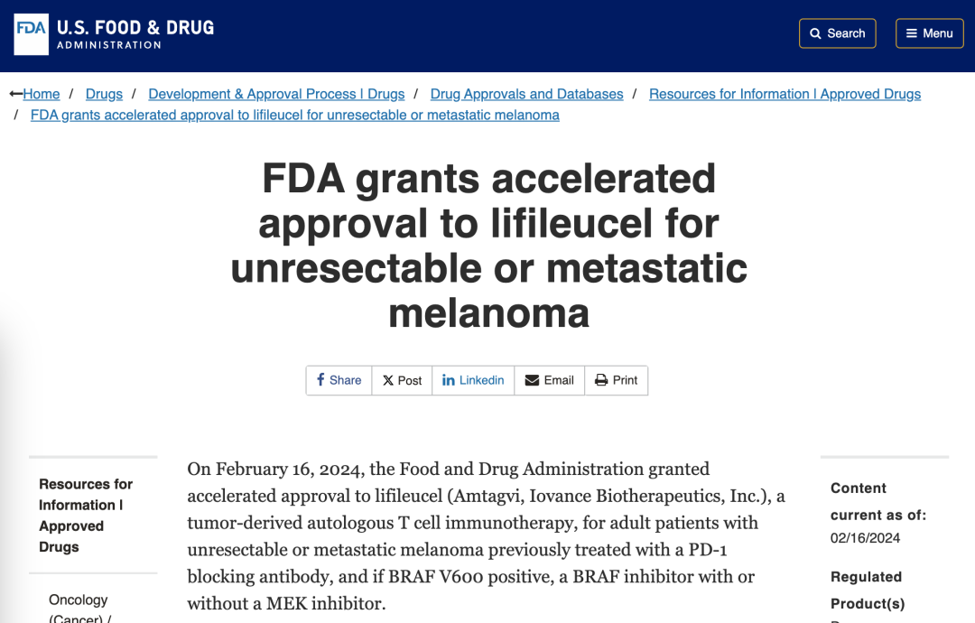 CBER 治疗产品办公室主任 Nicole Verdun 医学博士表示:黑色素瘤是一种危及生命的癌症,可能对受影响的个体造成毁灭性影响,并具有转移和扩散到身体其他部位的巨大风险。此次批准反映了 FDA 对为癌症患者开发创新、安全和有效的治疗方案的奉献和承诺。