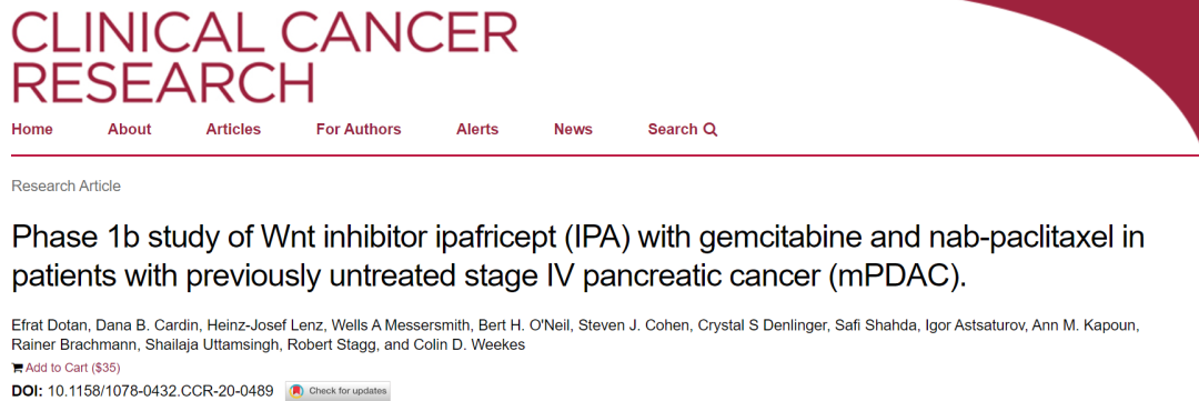 2020年7月21日,Clinical Cancer Research在线发表了一项关于Wnt抑制剂(Ipafricept ,IPA)+吉西他滨+白蛋白紫杉醇一线治疗晚期胰腺癌的Ⅰb期研究结果。该研究发现IPA与吉西他滨、白蛋白紫杉醇一起使用的安全性可耐受,有望使胰腺癌从治疗中获益。