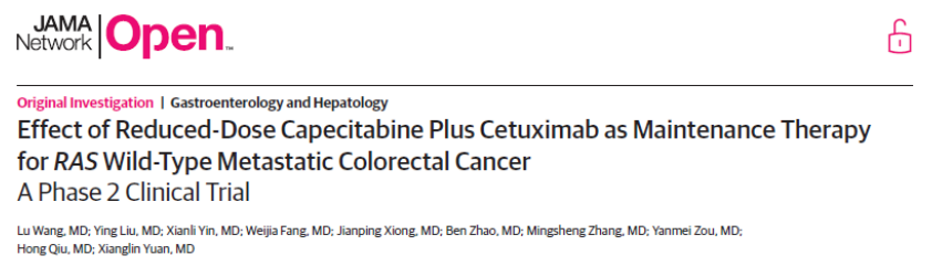 [2]LuWang, YingLiu, XianliYin,et al. Effect of Reduced-Dose Capecitabine Plus Cetuximab as Maintenance Therapy for RAS Wild-Type Metastatic Colorectal Cancer A Phase 2 Clinical Trial. JAMA Network Open. 2020
