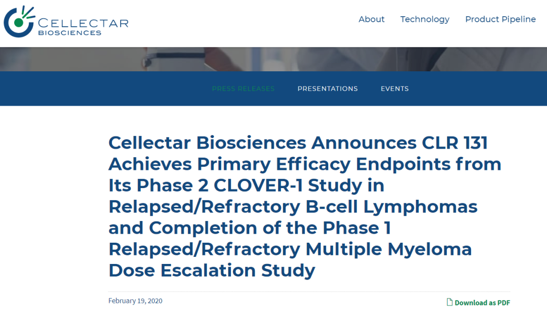 2020年7月22日,Cellectar Biosciences宣布在CLOVER-1 Ⅱ期研究中CLR 131治疗复发/难治性B细胞淋巴瘤达到主要研究终点,在复发/难治性淋巴浆细胞性淋巴瘤(LPL)和华氏巨球蛋白血症(WM)患者中的客观缓解率(ORR)达到100%。同时,I期剂量递增研究也已经完成。