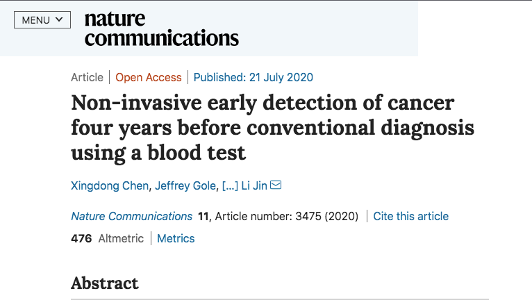 [1]Xingdong Chen, Jeffrey Gole, Athurva Gore, et al. Non-invasive early detection of cancer four years before conventional diagnosis using a blood test. Nature Communications. 2020