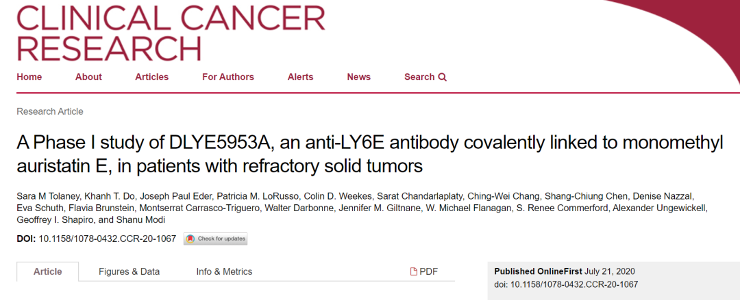 2020年7月21日,Clinical Cancer Research在线发表了一篇关于抗LY6E的ADC(抗体偶联药物)药物(DLYE5953A)治疗难治性实体瘤的Ⅰ期临床试验结果。该ADC药物是在抗LY6E的抗体上偶联抗肿瘤药物monomethyl auristatin E(MMAE),从而达到对肿瘤细胞的选择性杀伤,并且减轻毒副作用。